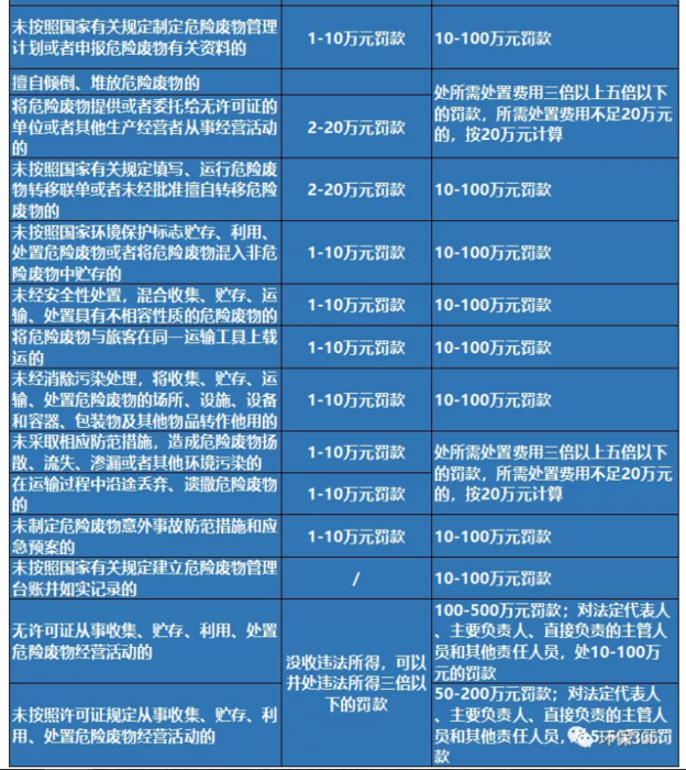 新固廢法普遍提高了對(duì)違法行為的罰款金額幅度,具體見下表: