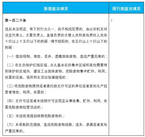 新固廢法對(duì)法律責(zé)任專章進(jìn)行了擴(kuò)充完善,加大了對(duì)固廢管理不合規(guī)的處罰力度,增加了企業(yè)的違法成本。除了對(duì)新增內(nèi)容設(shè)定了相應(yīng)罰則外,還普遍提高了違法行為的處罰金額,最高可罰至500萬元,并且增加了按日連續(xù)處罰、行政拘留、查封扣押等執(zhí)法措施,這些嚴(yán)格的法律責(zé)任變化也值得企業(yè)的特別關(guān)注。