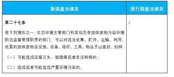 4.明確了對(duì)違法收集、貯存、運(yùn)輸、利用、處置的固體廢物及設(shè)施、設(shè)備、場(chǎng)所、工具、物品予以查封、扣押的規(guī)定